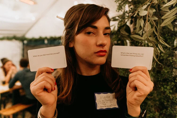 "The conversation took place at a gathering called Skip the Small Talk, which sold out of its 70 tickets at $10 apiece. Jumping off cue cards — 'What were your middle school and high school experiences like?' — the mostly young roomful of participants formed pairs and small groups to bypass the usual niceties and dive straight into topics both personal and sometimes confessional."